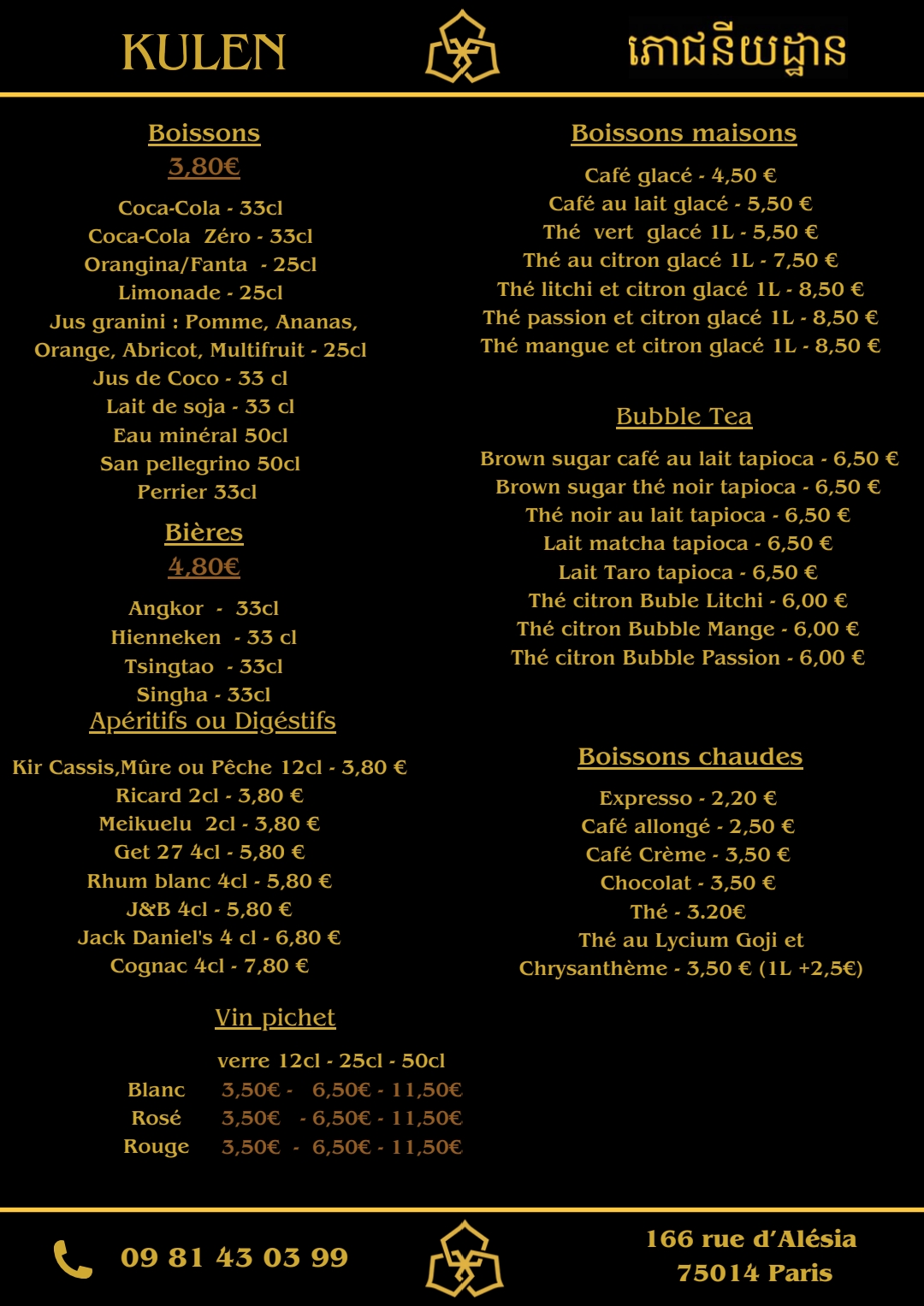 Réserver en ligneBienvenue chez Kulen, votre échappée gourmande au cœur du 14e arrondissement de Paris 🇰🇭. Découvrez les saveurs authentiques du Cambodge dans un cadre chaleureux et convivial 🍜. Nos spécialités cambodgiennes, préparées avec soin, raviront vos papilles, que vous soyez amateur de plats épicés ou de recettes plus douces 🌶️.